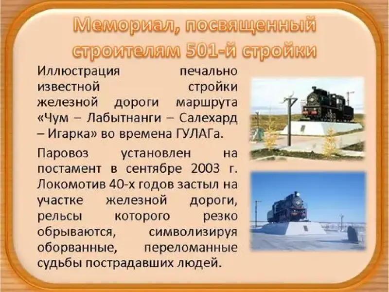 Мемориал, посвященный строителям 501-й стройки - иллюстрациия печально известной стройки железной дороги маршрута "Чум - Лабытнанги - Салехард - Игарка" во времена ГУЛАГа.