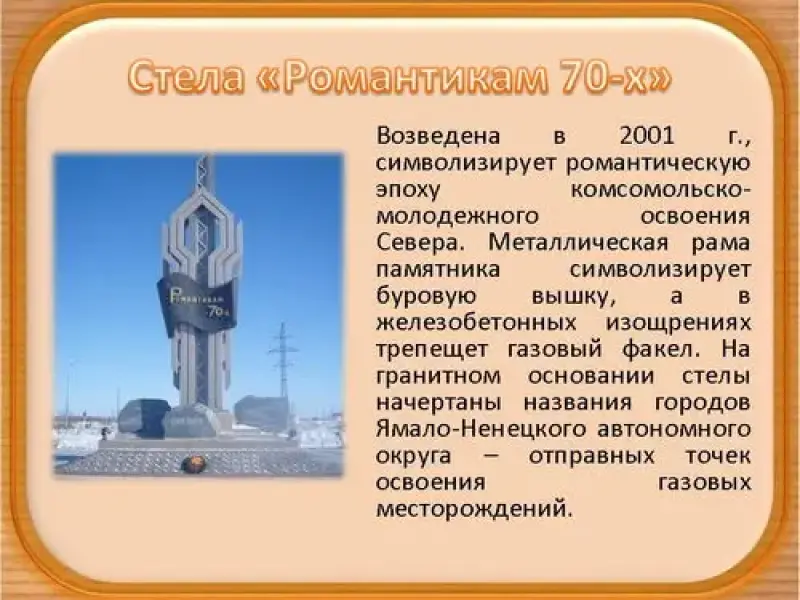 Стела "Романтикам 70-х" - возведена в 2001 г., символизирует романтическую эпоху комсомольско-молодежного освоения Севера. Металлическая рама памятника символизирует буровую вышку, а в железобетонных изощрениях трепещет газовый факел. На гранитном основании стелы начертаны названия городов Ямало-Ненецкого автономного округа - отправных точек освоения газовых месторождений. (слайд 7)