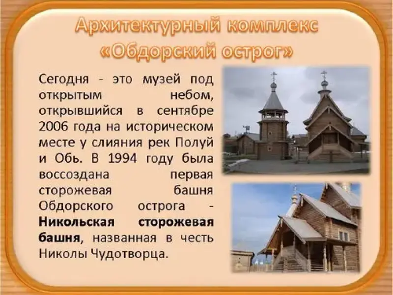 Архитектурный комплекс "Обдорский острог". Сегодня - это музей под открытым небом, открывшийся в сентябре 2006 года на историческом месте у слияния рек Полуй и Обь. В 1994 году была воссоздана первая сторожевая башня Обдорского острога - Никольская сторожевая башня, названная в честь Николы Чудотворца. (слайд 9)