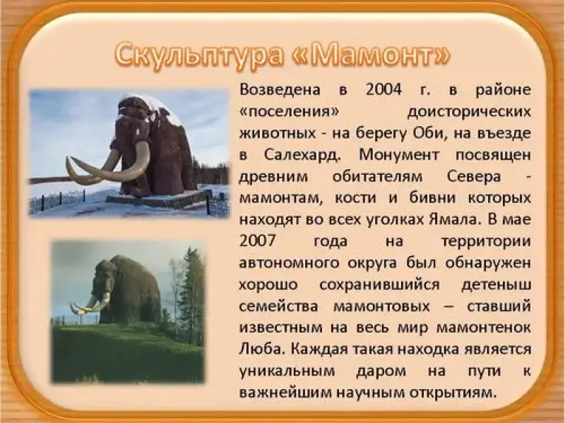 Скульптура "Мамонт" - возведена в 2004 г. в районе "поселения" доисторических животных - на берегу Оби, на въезде в Салехард. Монумент посвящен древним обитателям Севера - мамонтам, кости и бивни которых находят во всех уголках Ямала. В мае 2007 года на территории автономного округа был обнаружен хорошо сохранившийся детеныш семейства мамонтовых - ставший известным на весь мир мамонтенок Люба. Каждая такая находка является уникальным даром на пути к важнейшим научным открытиям. (слайд 10)