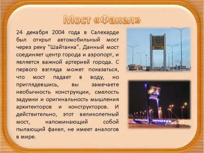 Мост "Факел" - 24 декабря 2004 года в Салехарде был открыт автомобильный мост через реку "Шайтанка". Данный мост соединяет центр города и аэропорт, и является важной артерией города. С первого взгляда может показаться, что мост падает в воду, но приглядевшись, вы замечаете необычность конструкции, смелость задумки и оригинальность мышления архитекторов и конструкторов. И действительно, этот великолепный мост, напоминающий собой пылающий факел, не имеет аналогов в мире. (слайд 11)