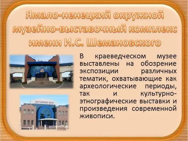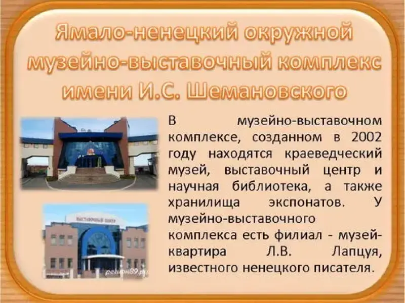 Ямало-Ненецкий окружной музейно-выставочный комплекс имени И.С. Шемановского. В музейно-выставочном комплексе, созданном в 2002 году находятся краеведческий музей, выставочный центр и научная библиотека, а также хранилища экспонатов. У музейно-выставочного комплекса есть филиал - музей-квартира Л.В. Лапцуя, известного ненецкого писателя. В краеведческом музее выставлены на обозрение экспозиции различных тематик, охватывающие как археологические периоды, так и культурно-этнографические выставки и произведения современной живописи. (слайд 12, 13)