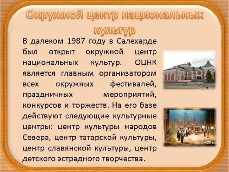 Окружной центр национальных культур. В далеком 1987 году в Салехарде был открыт окружной центр национальных культур. ОЦНК является главным организатором всех окружных фестивалей, праздничных мероприятий, конкурсов и торжеств. На его базе действуют следующие культурные центры: центр культуры народов Севера, центр татарской культуры, центр славянской культуры, центр детского эстрадного творчества. (слайд 14)