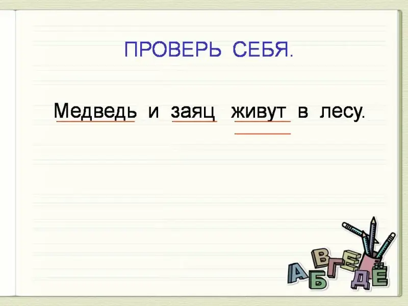 «Медведь и заяц живут в лесу.» - Какие должны помнить основные правила, чтобы правильно оформить предложение? (Большая буква в начале, в конце знак) (Слайд 7) - Подчеркните в предложении грамматическую основу. |