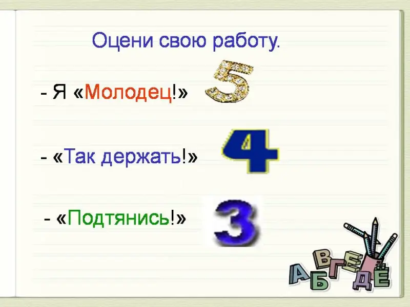 - Кто уверен в себе. в своих знаниях и умениях? - Предположительно, на какую оценку вы выполните диктант? (Положительную) - Оцените свою работу на уроке? (Слайд 10) |