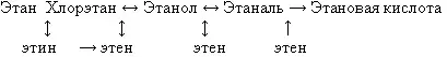 - Карбид кальция→Ацетилен→Ацетальдегид→Этиловый спирт→Хлорэтан