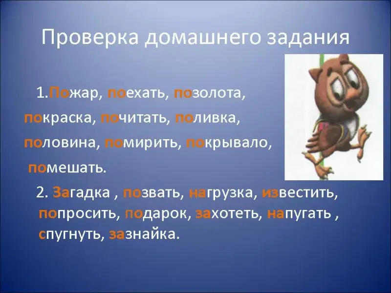 Сережа. В первой группе я выбрал такие слова: пожар, поехать, позолота, покрас-ка, почитать, поливка, помирить, покрывало, помешать, половина.