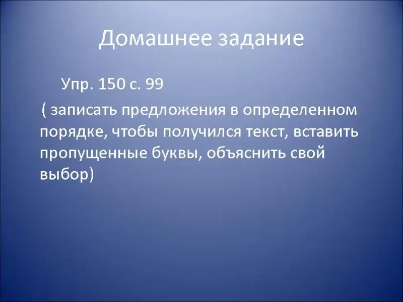 X. Домашнее задание. Упр. 150 с. 99 (записать предложения в определенном порядке, чтобы получился связный текст; вставить пропущенные буквы, объяснить свой выбор.)