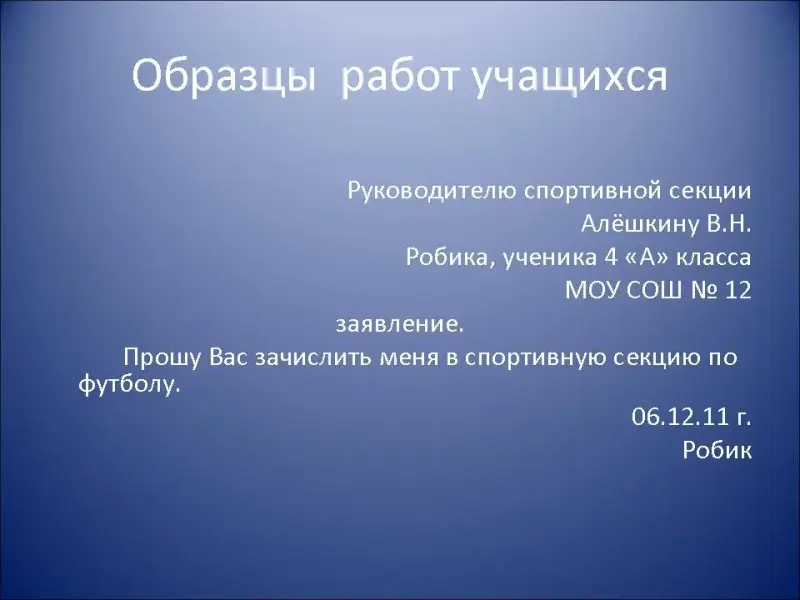 Прошу Вас зачислить меня в спортивную секцию по футболу.