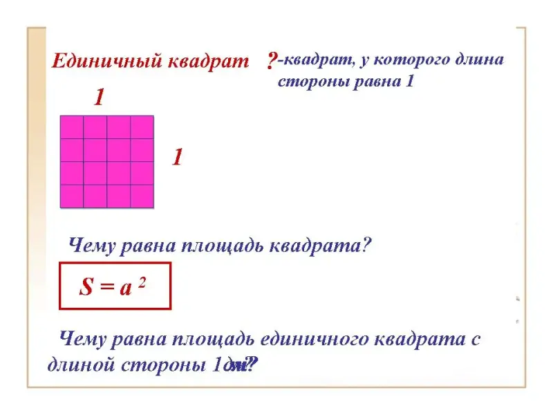 Учитель: Чему равна площадь единичного квадрата, если длина его стороны 1 см (дм, м, км)?