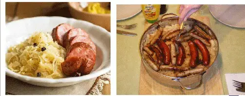 Die deutsche Kuche steht nicht an der Spitze. Typisch deutsches Essen gibt es wenig. Die Weisswurst mit Brezen und Schweinshaxn mit Krautkohl sind beliebteste Spezialitaten in Bayern. Das deutsche Fruhstuck ist gewohnlich reichhaltig. Zum Fruhstuck isst man Wurst, Kase, Eier, Marmelade, Butter, Geback, Cornflakes. Man trinkt Kaffe oder Tee oder Orangensaft. Mittags isst man oft in der Kantine. Meistens ist es ein Stuck Schweinefleisch mit Gemuse und Kartoffeln oder Erbsensuppe oder Bohnensuppe mit Wurstchen. Das Abendessen ist nicht sehr originell: belegte Brotchen. In den letzten Jahren sind in der BRD griechische, italenische, turkische, spanische oder chinesische sehr beliebt.
