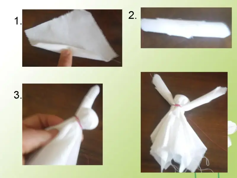 - Берем квадрат белой ткани, кладем небольшое количество ваты и формируем голову. На месте предполагаемой шеи перевязываем красной ниткой. Нитку обматываем, не завязывая.