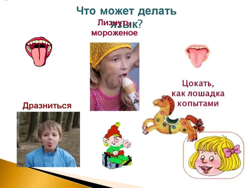 Слайд 5. Звуковичок предлагает детям рассказать, что они могут языком (лизнуть мороженное, дразниться (отмечается, что воспитанные дети так не поступают), цокать, как лошадка копытами).