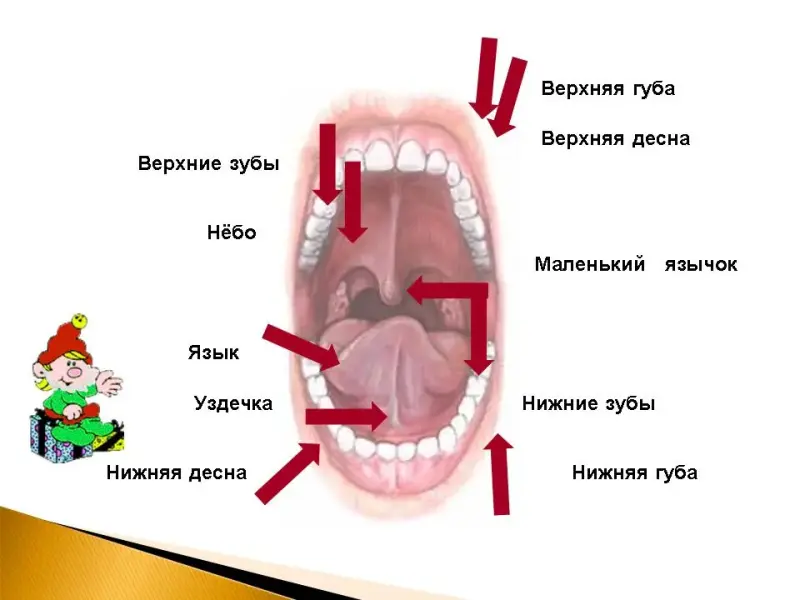 Слайд 8. Аналогично проводится работа по более подробному ознакомлению с устройством ротовой полости. Рассматриваются верхняя и нижняя губы, верхние и нижние зубы, верхние и нижние десны, язык, уздечка, нёбо - «потолок», маленький язычок.