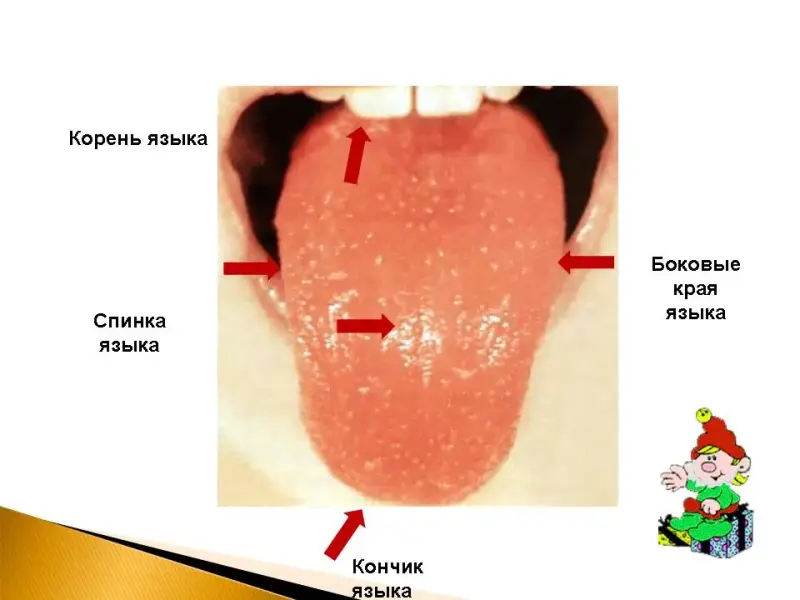 Слайд 9. Дети знакомятся с языком: кончик, боковые края, спинка, корень.