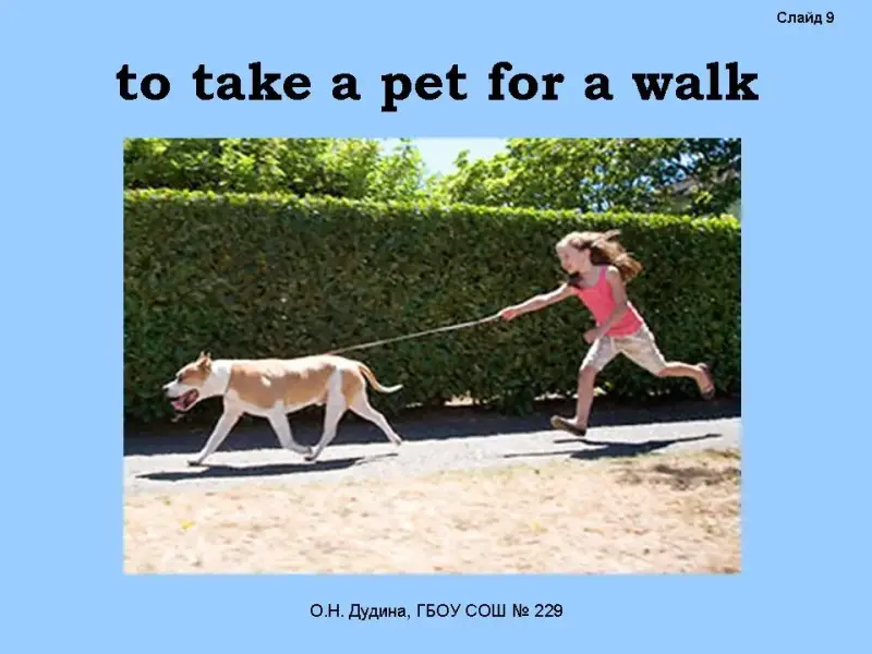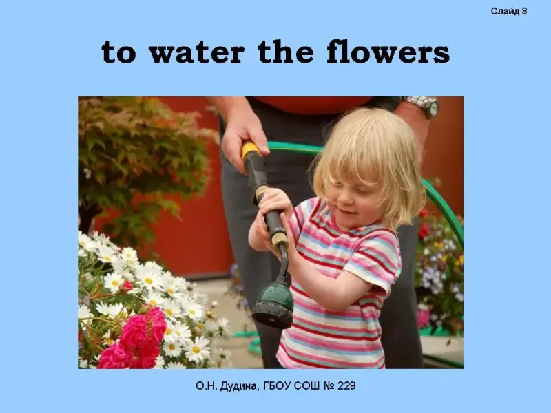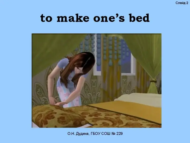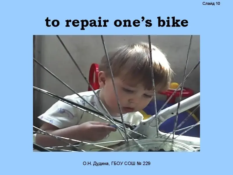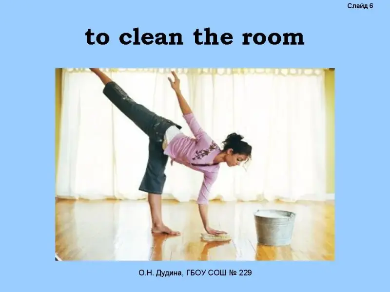 Look at the whiteboard. There are some new words here. Listen, repeat and remember: · to make one's bed · to lay the table · to do the washing up · to answer the phone calls · to clean the room · to feed the pеt · to water the flowers · to take a pet for a walk · to repair one's bike <Слайды 2-10> (The photos are shown in the presentation. Pupils look through and repeat the new words). |