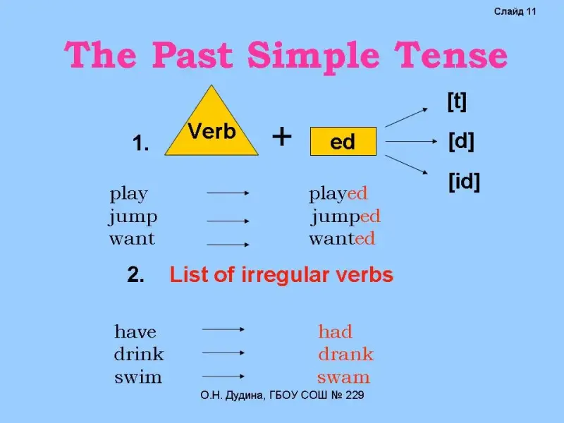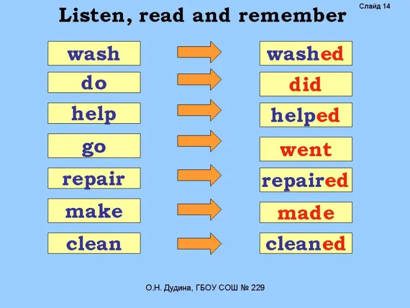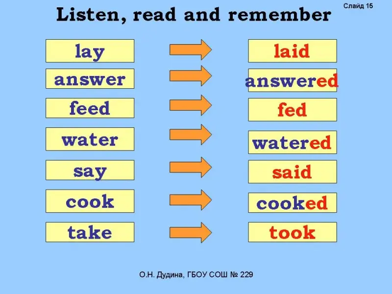 and remember the second form of the verbs. <Слайды 14-15> (Students listen to a disk, read the verbs after the announcer* Аудиоприложение к учебнику). |