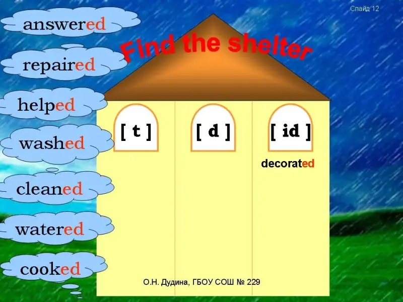 P1:Regular and irregular verbs. T.: Right. How do we form the second form of regular verbs? P2: We add the ending - ed T.: Yes, we add the ending -ed. As you know, it sounds like [t], [d], [id]. It depends on the last letter <Слайд 11> Let's play the game «Find the shelter»/ «Укрой от дождя». Look at the whiteboard. There are 8 regular verbs in the second form. Divide them into three columns. For example, «decorated» to the third column <Слайд 12>. (The columns are shown in the presentation. Pupils write the verbs repaired/ answered/ cleaned/cooked/ watered/washed/helped on the whiteboard) |