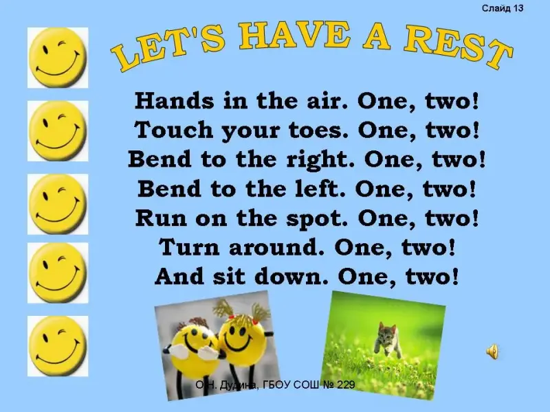 T.: Please, children, stand up and have a rest. Do the actions with the music (<Слайд 13> *Музыка для физкультминутки - по выбору учителя ). | Have a rest | Whole class |