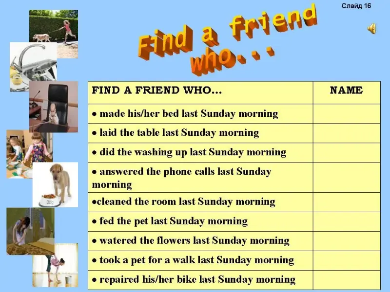 T.: Play the game «Find a friend who…». You have a table to complete <Слайд 16>; <Приложение