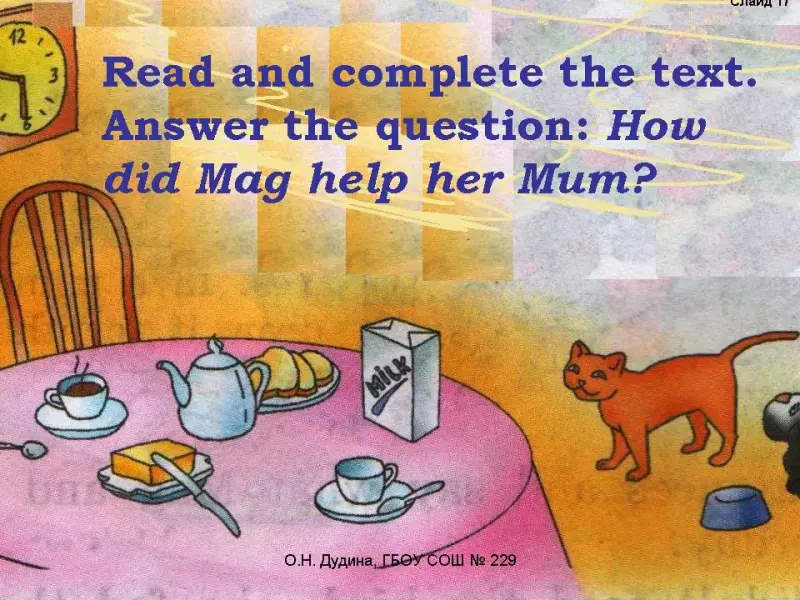 (Children read the story, open the brackets and put the verbs into the second form. T.: How did Mag help her Mum? P1: Mag made her bed etc.) |