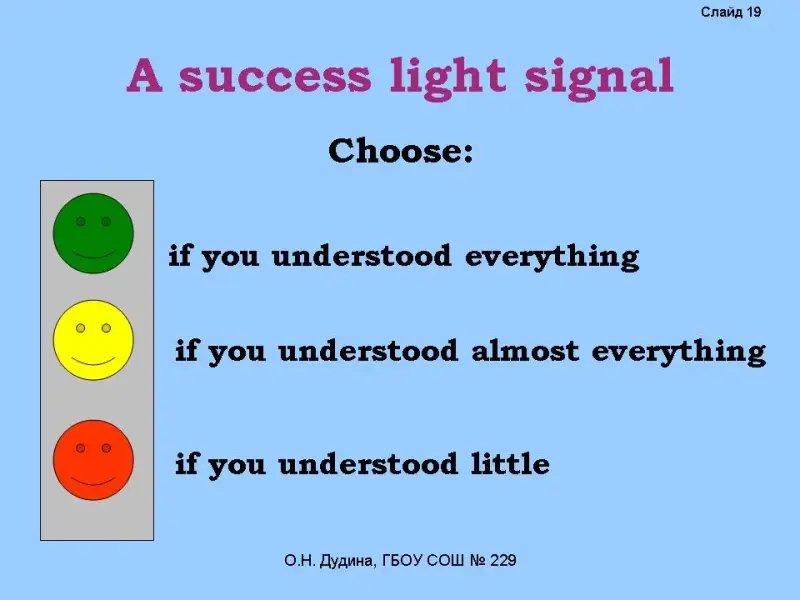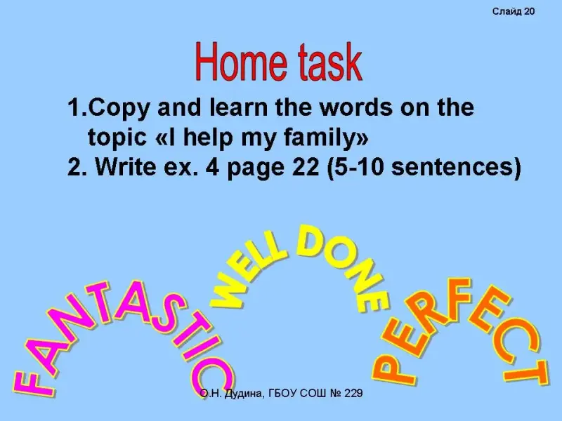 Jason: Oh, it's ashamed of me! I don't want to be lazy! Granny, come back home! I'll help my family at home! Thank you, boys and girls! Bye! T.: Bye, Jason! Don't be lazy! Remember: "Helping makes you stronger"! Bye, Mrs. Wilson! <Слайд 18> (The actors are going out). T.: Today you have learnt the words on the topic "I helping my family". There are a lot of things to do at home. What are they? (Children reply with the words they have learned: to go shopping, to make one's bed, to lay the table and so on). It's up to you to decide what to do. T.: According to the results of your work you get the following marks… On your desks you've got three circles: green, yellow and red like in traffic lights <Слайд 19><Приложение 2>. The green one if you understood everything; The yellow one if you understood almost everything; The red one if you understood little; Your home task is: 1. to copy and learn the words on the topic " I help my family"; 2. to write ex.4 page 22 (5-10 sentences). T.: Thank you very much for your work in the lesson. You are so active and it's great. That's all for today <Слайд20> Goodbye rhyme Time to finish now Stop our work and fun See you on Friday (name day of next lesson) Goodbye, everyone! |