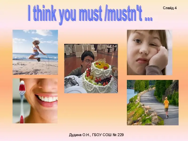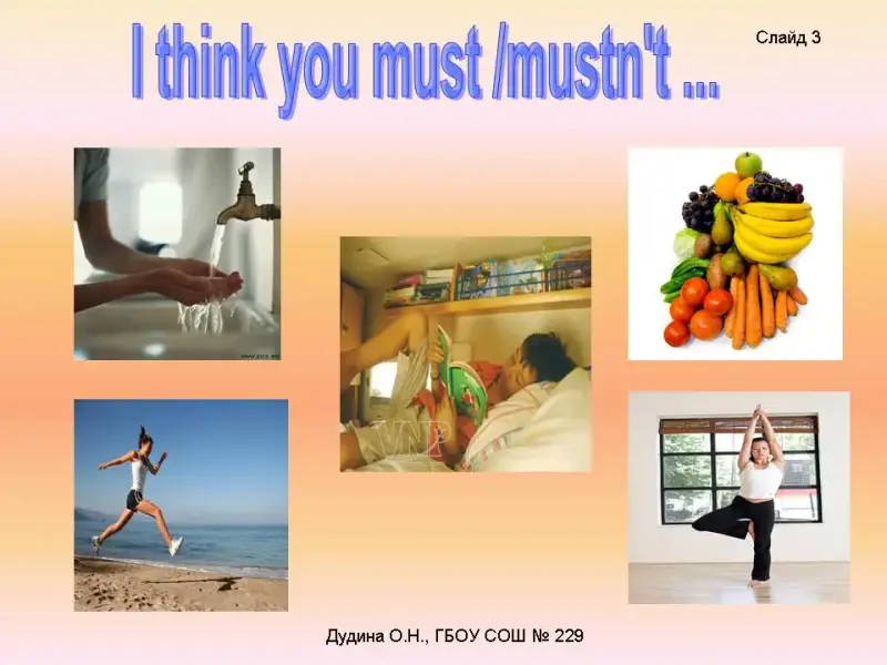 T.: Play the game «Follow my advice». You have to look through the pictures and advise your classmates to do some activities <Слайд 3> <Cлайд