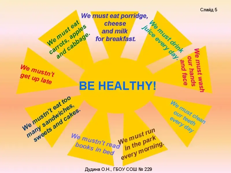 Good morning. Good morning. How are you? I'm fine, thanks. And me too! Teacher (T.): Good morning, dear pupils! I'm glad to see you today. It's too early! Follow my instructions and … wake up! Утренняя зарядка «Wake up!» · Pull the lobes of your ears from top to bottom (3 times); · Pull the helix up (3 times); · Pull the helix from the outside (3 times); · Circular motion of your helix clockwise/anticlockwise (3 times); · Keep smile! I hope you're fine and ready to work, aren't you? So, let's start our lesson. Today we're going to the modal verb «must» and revise the vocabulary for the topic "Health is above wealth" <Слайд 1>. |