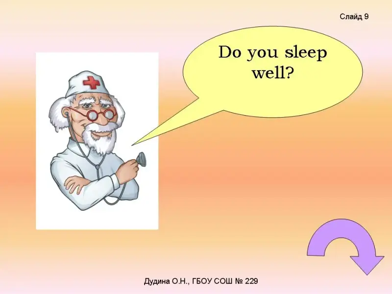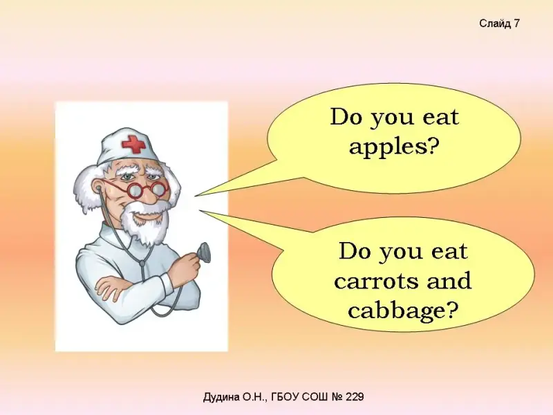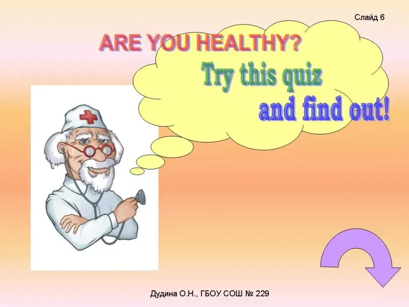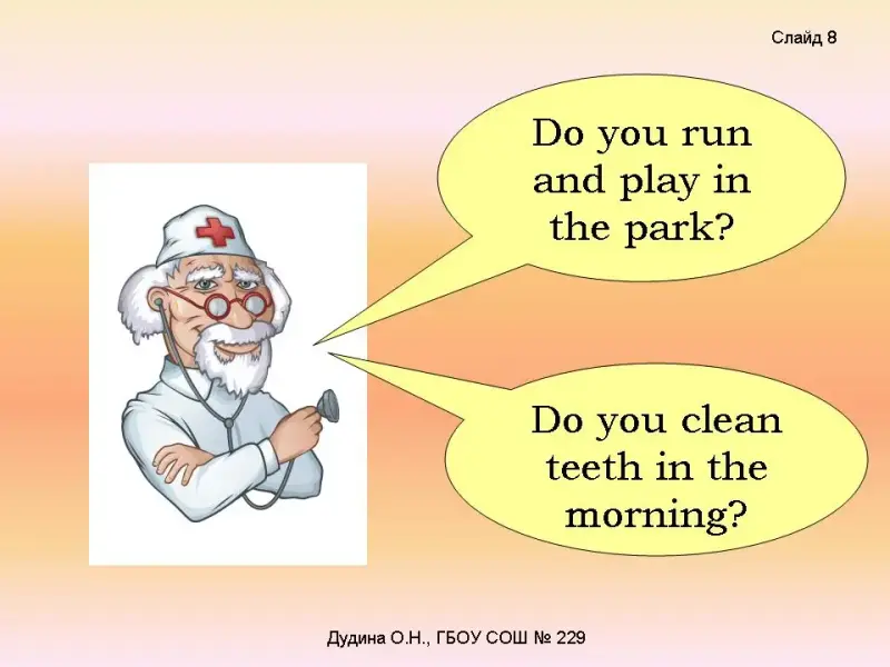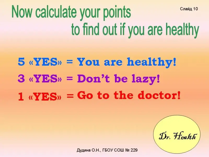 - Do you eat apples? - Do you eat carrots and cabbage? - Do you run and play in the park? - Do you clean teeth in the morning? - Do you sleep well? <Слайд 6-9>. Dr.Health: Now calculate your points and find out if you're healthy! 5 «yes» = You are healthy! 3 «yes» = Don't be lazy! 1 «yes» = Go to the doctor! <Слайд 10>. |