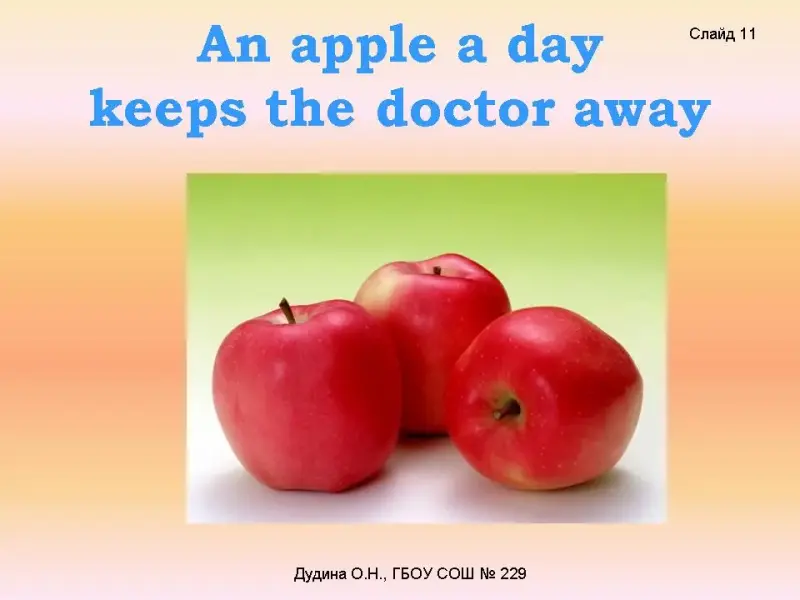 Dr. Health.: Thank you, pupils. As I see, you'd like to be healthy and happy. Remember: "An apple a day keeps the doctor away"! Bye! <Слайд 11>.