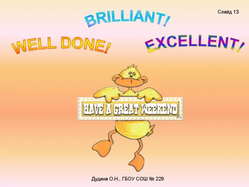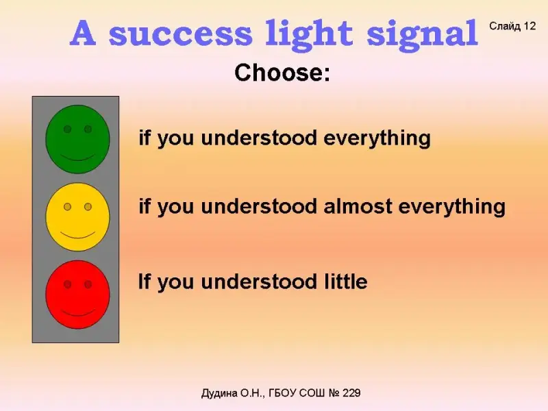 T.: Bye, Dr. Health! We don't want to be lazy! We'd like to be healthy! (The actor is going out). T.: Today you have learnt the modal verb «must» and revise the vocabulary for the topic "Health is above wealth". It's up to you to decide what advice to follow. T.: According to the results of your work you get the following marks… On your desks you've got three circles: green, yellow and red like in traffic lights <Слайд 12>;<Приложение 3>. The green one if you understood everything; The yellow one if you understood almost everything; The red one if you understood little; Tomorrow it'll be a weekend and that's why haven't got any home task. Thank you very much for your work in the lesson. You are so active and it's great. Have a great weekend! <Слайд 13>. Goodbye rhyme Time to finish now Stop our work and fun See you on Monday (name day of next lesson) Goodbye, everyone! |