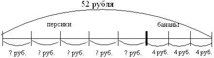 - Составьте 2-е действие. (Я знаю, что вся покупка стоит 52 рубля, стоимость бананов - 12 рублей. Я могу узнать стоимость персиков: 52 - 12 = 40 (руб.).)