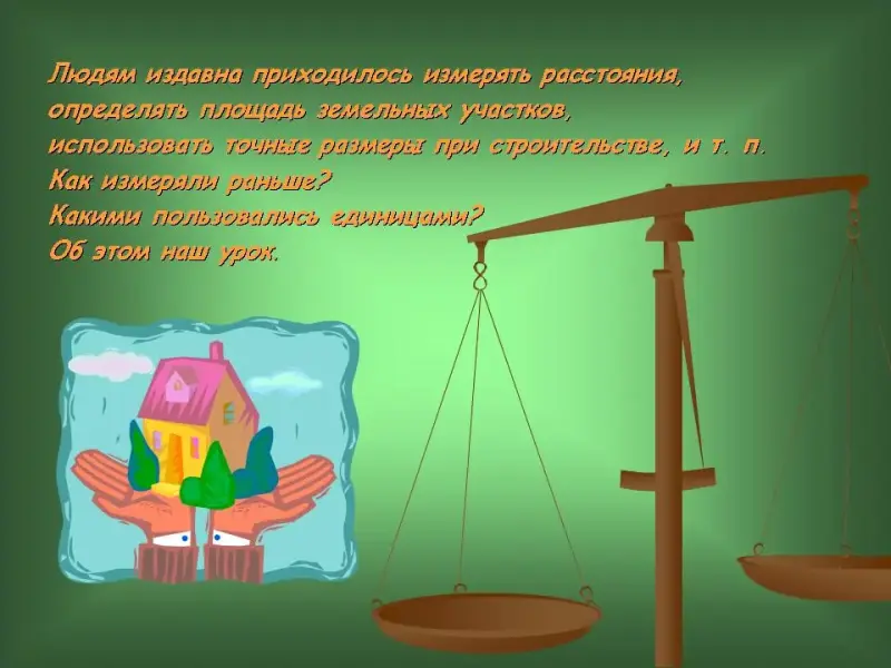4 слайд. Людям издавна приходилось измерять расстояния, определять площадь земельных участков, использовать точные размеры при строительстве, и т.п. Как измеряли раньше? Какими пользовались единицами? Об этом наш урок.