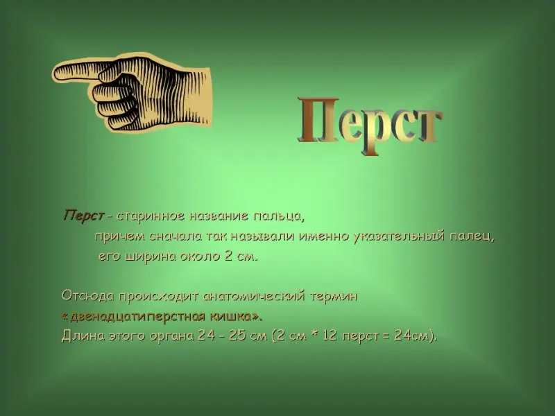 8 слайд. Перст. Перст - старинное название пальца, причем сначала так называли именно указательный палец, его ширина около 2 см.