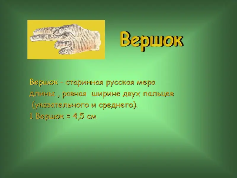 11 слайд. Вершок. Вершок - старинная русская мера длины , равная ширине двух пальцев (указательного и среднего). 1 Вершок = 4,5 см