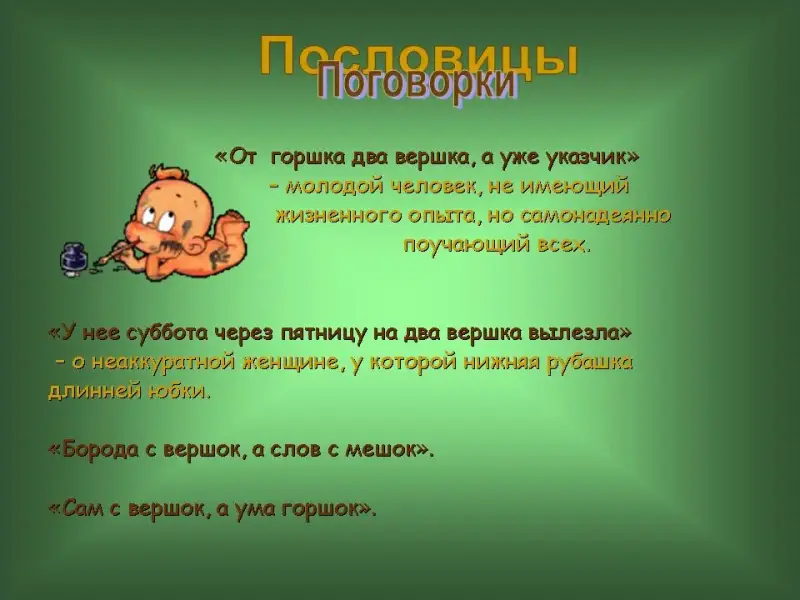 12 слайд. "От горшка два вершка, а уже указчик" - молодой человек, не имеющий жизненного опыта, но самонадеянно поучающий всех.