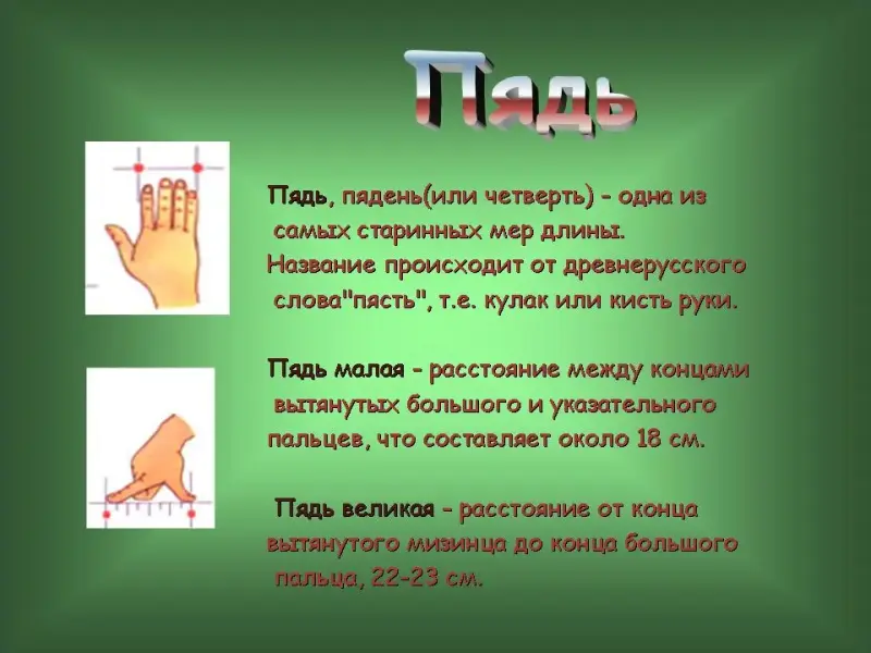14 слайд. Пядь. Пядь, пядень (или четверть) - одна из самых старинных мер длины. Название происходит от древнерусского слова "пясть", т.е. кулак или кисть руки.