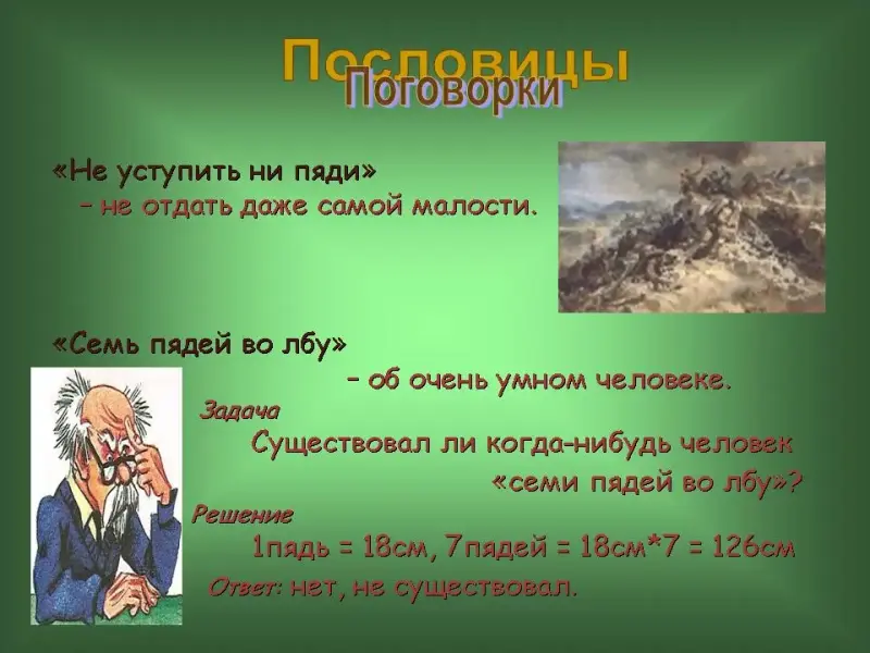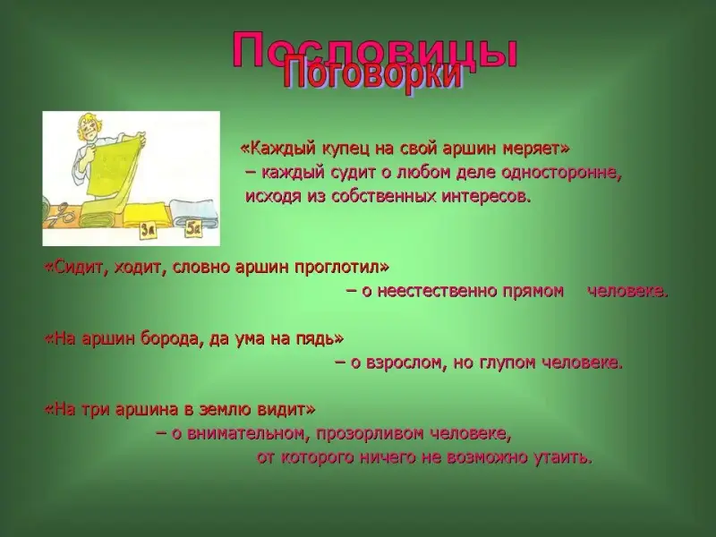 19 слайд. "Каждый купец на свой аршин меряет" - каждый судит о любом деле односторонне, исходя из собственных интересов. "Сидит, ходит, словно аршин проглотил" - о неестественно прямом человеке. "На аршин борода, да ума на пядь" - о взрослом, но глупом человеке. "На три аршина в землю видит" - о внимательном, прозорливом человеке, от которого ничего невозможно утаить.