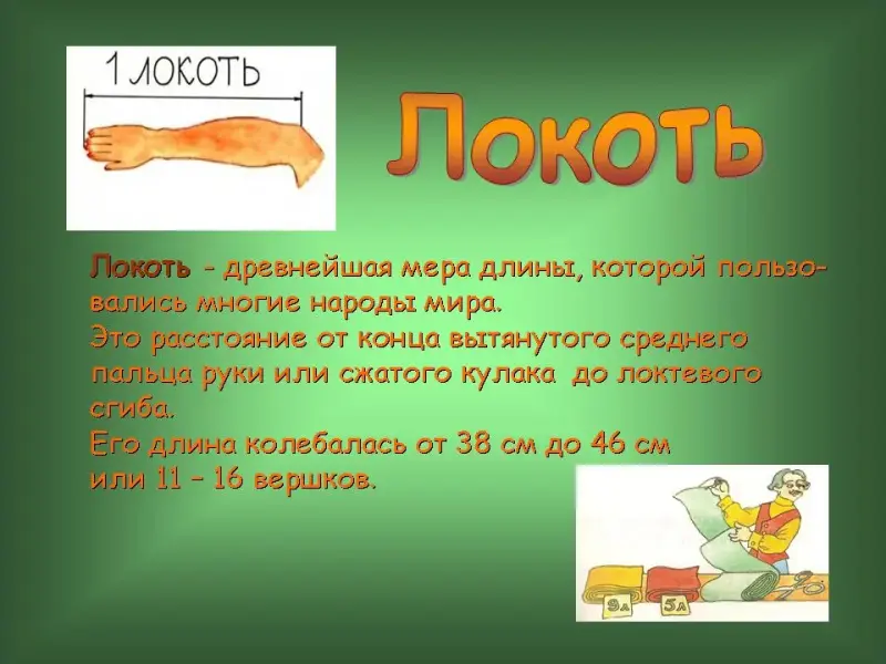 16 слайд. Локоть. Локоть - древнейшая мера длины, которой пользовались многие народы мира. Это расстояние от конца вытянутого среднего пальца руки или сжатого кулака до локтевого сгиба.
