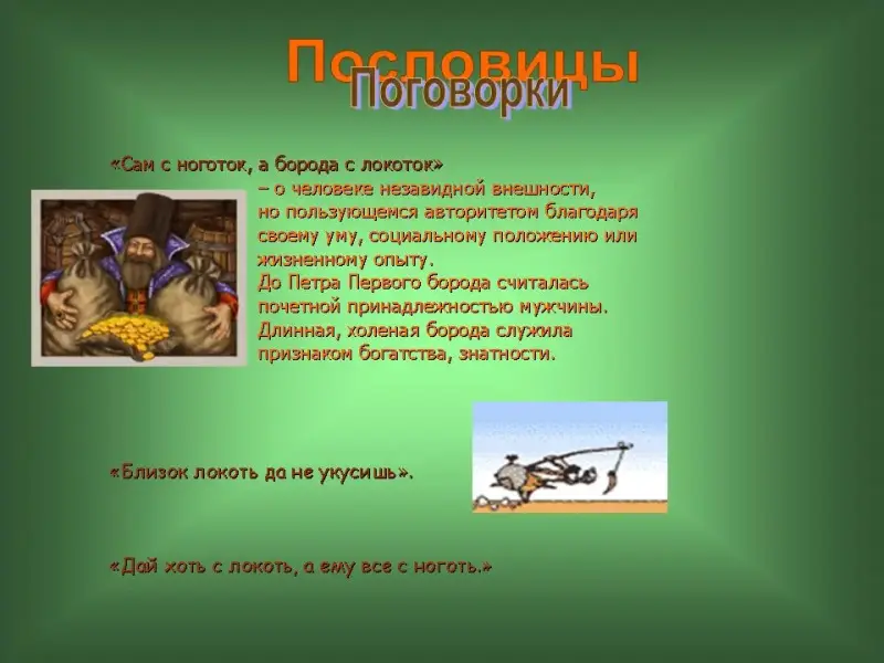 17 слайд. "Сам с ноготок, а борода с локоток" - о человеке незавидной внешности, но пользующемся авторитетом благодаря своему уму, социальному положению или жизненному опыту.
