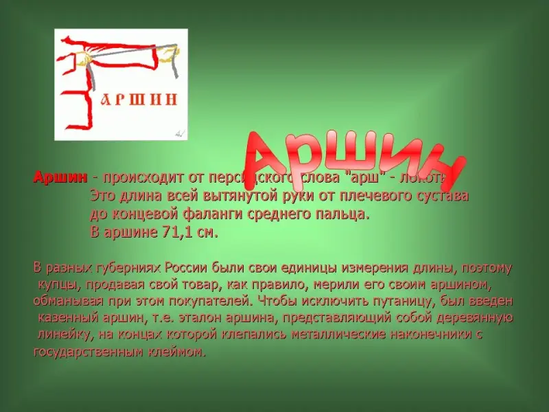 18 слайд. Аршин - происходит от персидского слова "арш" - локоть. Это длина всей вытянутой руки от плечевого сустава до концевой фаланги среднего пальца. В аршине 71,1 см. В разных губерниях России были свои единицы измерения длины, поэтому купцы, продавая свой товар, как правило, мерили его своим аршином, обманывая при этом покупателей. Чтобы исключить путаницу, был введен казенный аршин, т.е. эталон аршина, представляющий собой деревянную линейку, на концах которой клепались металлические наконечники с государственным клеймом.