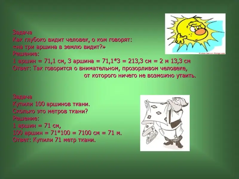 20 слайд. Задача: Как глубоко видит человек, о ком говорят: "на три аршина в землю видит?"