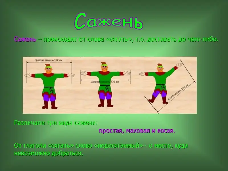 25 слайд. "Косая сажень" - (216 см) расстояние от пальцев левой ноги до конца пальцев поднятой правой руки. "Косая сажень в плечах" - широкоплечий, высокого роста человек. "Полено к полену - сажень" - о накоплении запасов, богатства путем экономии.