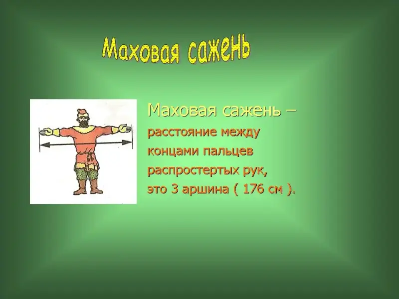 24 слайд. Маховая сажень - расстояние между концами пальцев распростертых рук, это 3 аршина (176 см ).