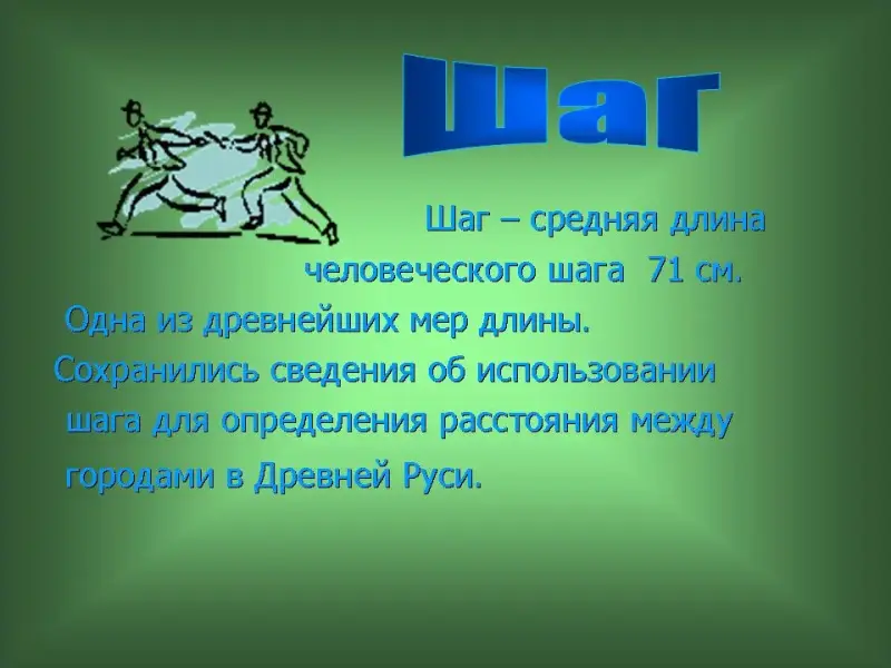 26 слайд. Шаг - средняя длина человеческого шага 71 см. Одна из древнейших мер длины. Сохранились сведения об использовании шага для определения расстояния между городами в Древней Руси.