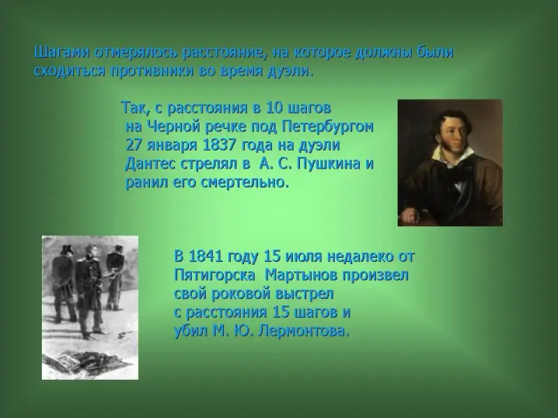 27 слайд. Шагами отмерялось расстояние, на которое должны были сходиться противники во время дуэли. Так, с расстояния в 10 шагов на Черной речке под Петербургом 27 января 1837 года на дуэли Дантес стрелял в А.С. Пушкина и ранил его смертельно. В 1841 году 15 июля недалеко от Пятигорска Мартынов произвел свой роковой выстрел с расстояния 15 шагов и убил М. Ю. Лермонтова.