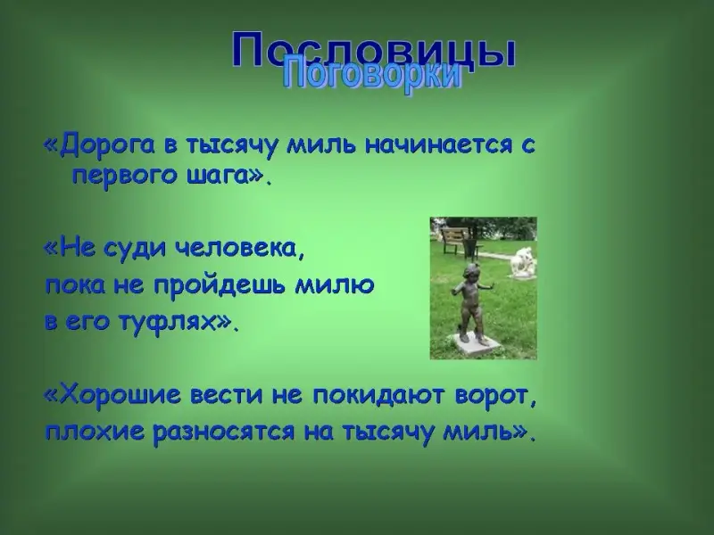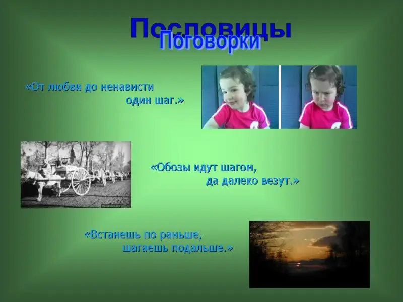 29 слайд. "От любви до ненависти один шаг." "Обозы идут шагом, да далеко везут." "Встанешь по раньше, шагаешь подальше."