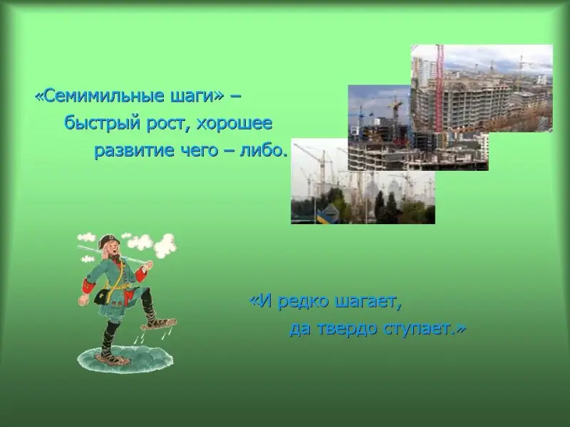 30 слайд. "Семимильные шаги" - быстрый рост, хорошее развитие чего - либо. "И редко шагает, да твердо ступает."