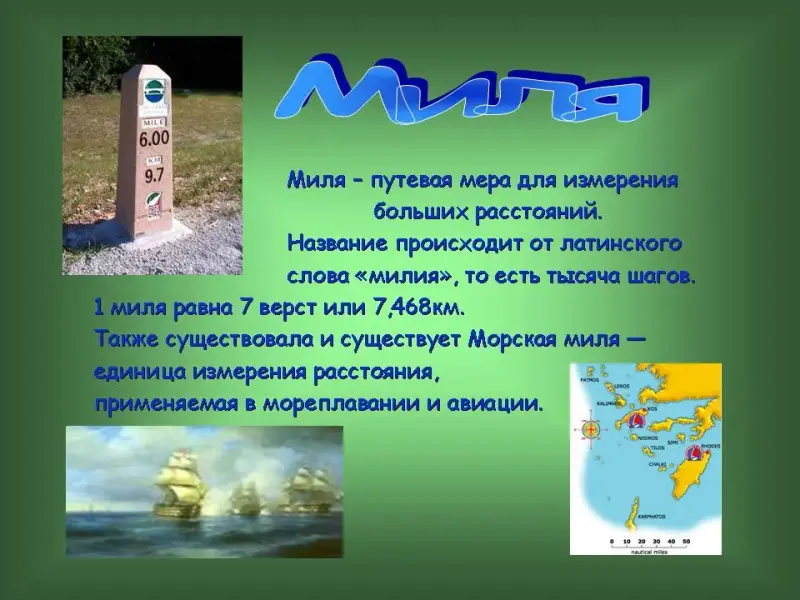 31 слайд. Миля - путевая мера для измерения больших расстояний.