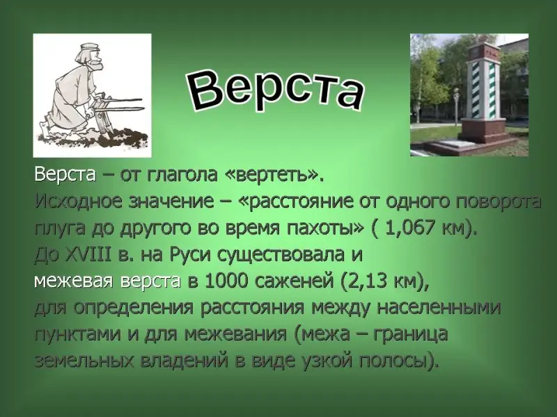 33 слайд. Верста - от глагола "вертеть". Исходное значение - "расстояние от одного поворота плуга до другого во время пахоты" (1,067 км). До XVIII в. на Руси существовала и межевая верста в 1000 саженей (2,13 км), для определения расстояния между населенными пунктами и для межевания (межа - граница земельных владений в виде узкой полосы).